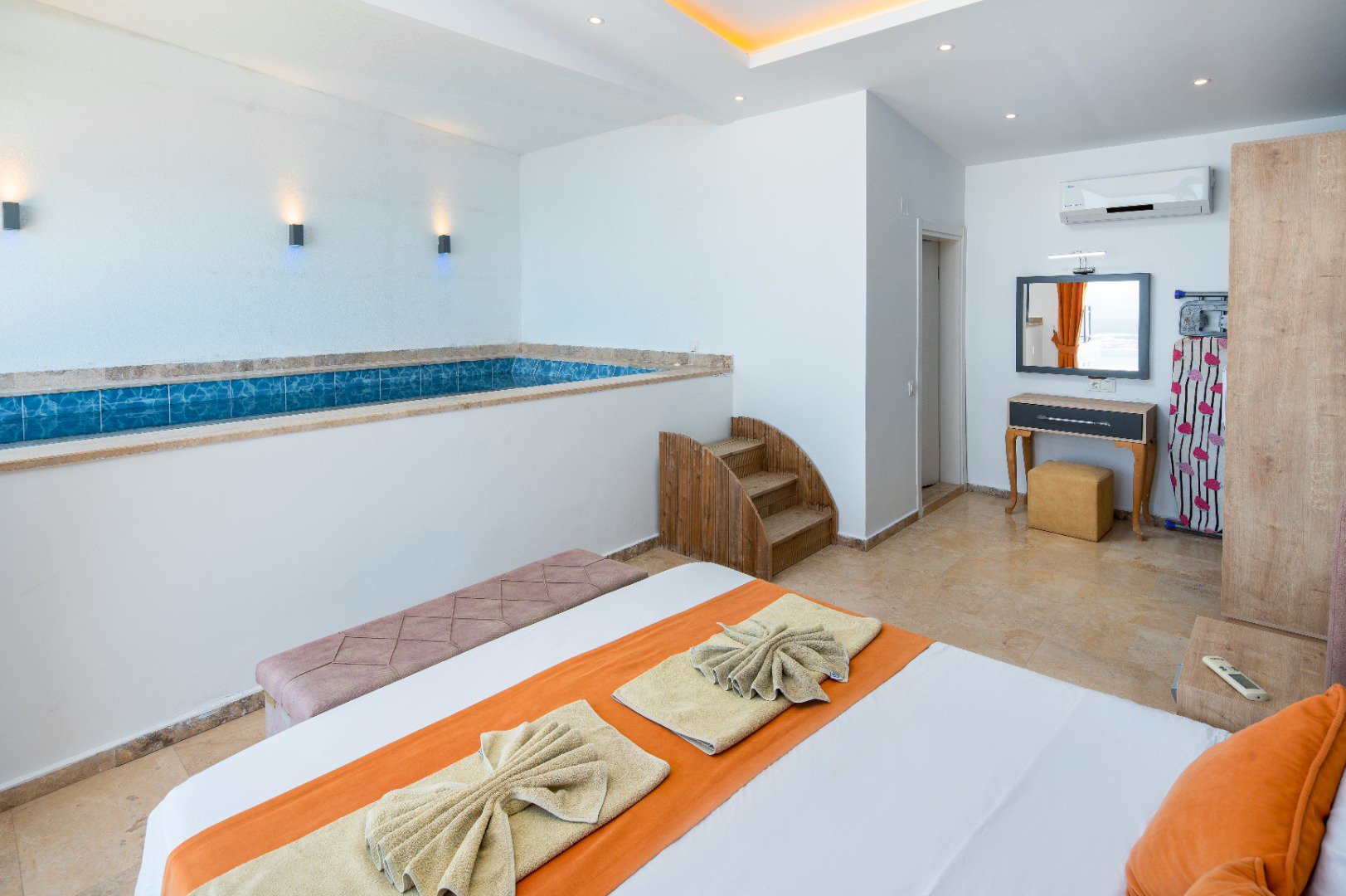 A heated indoor pool measuring 2m x 4m, positioned right across from your bedroom.