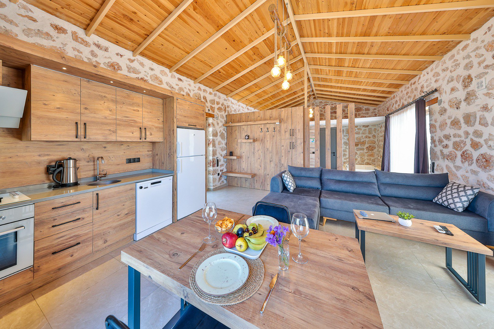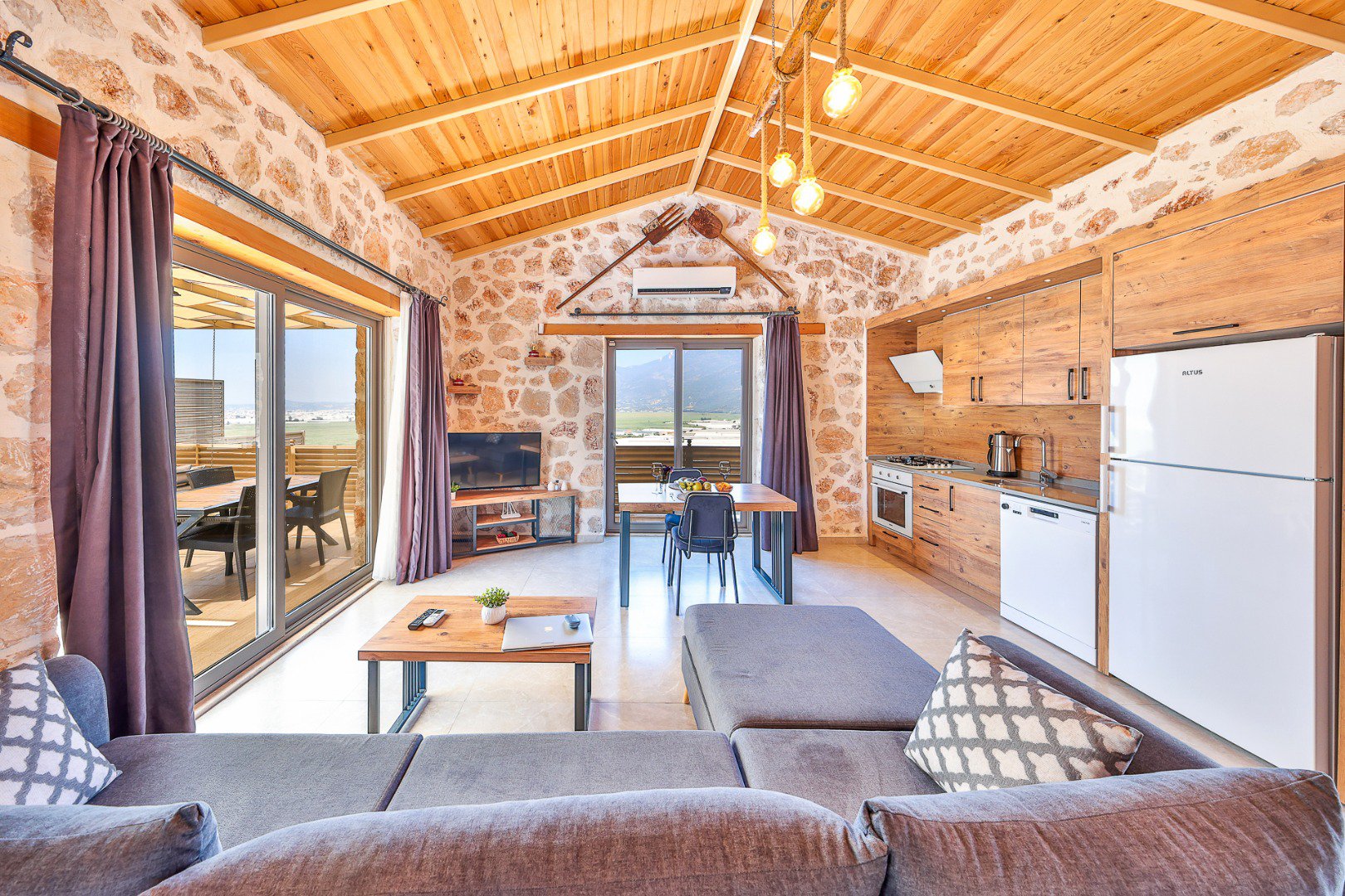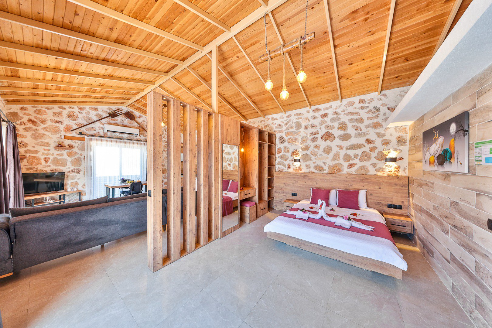 Located in the heart of a breathtaking natural landscape, our villa features a 1+1 layout. Thanks to its large glass doors, guests can enjoy the enchanting beauty of nature at every moment.