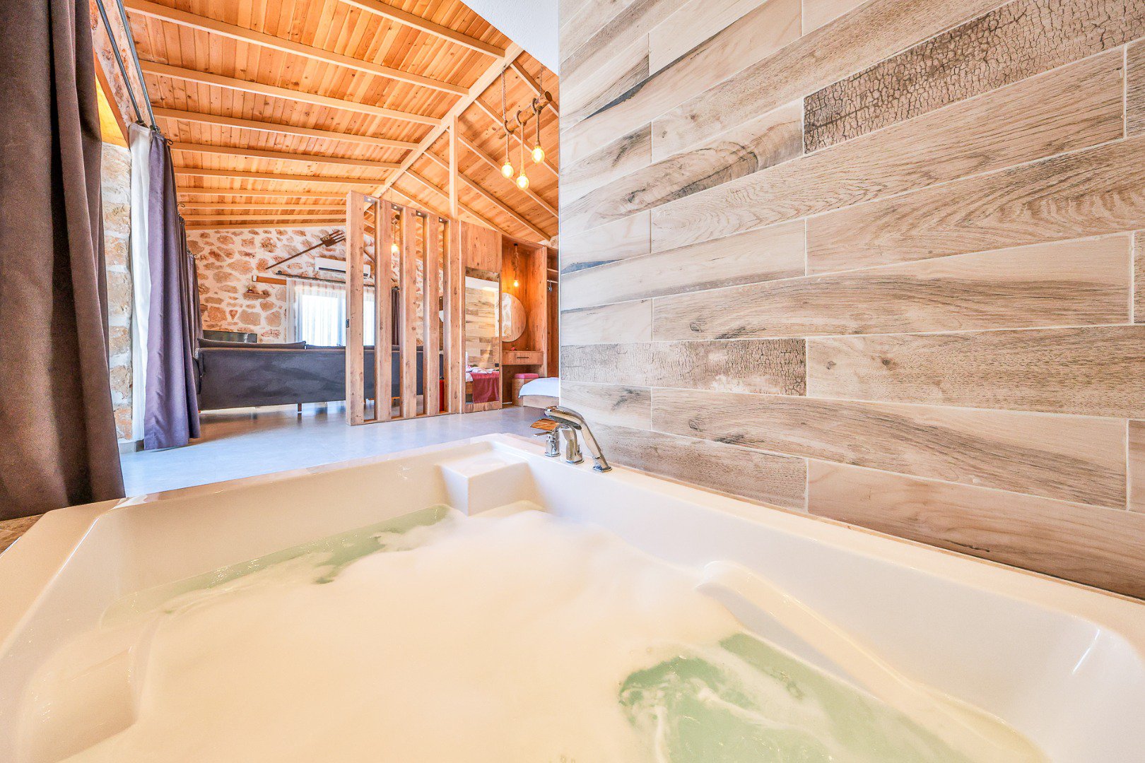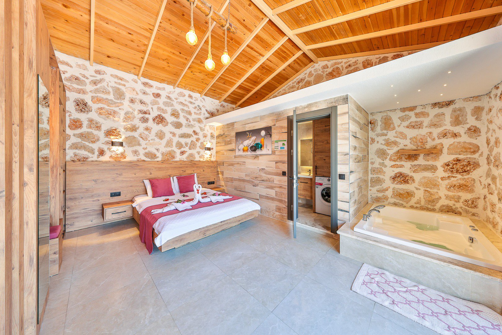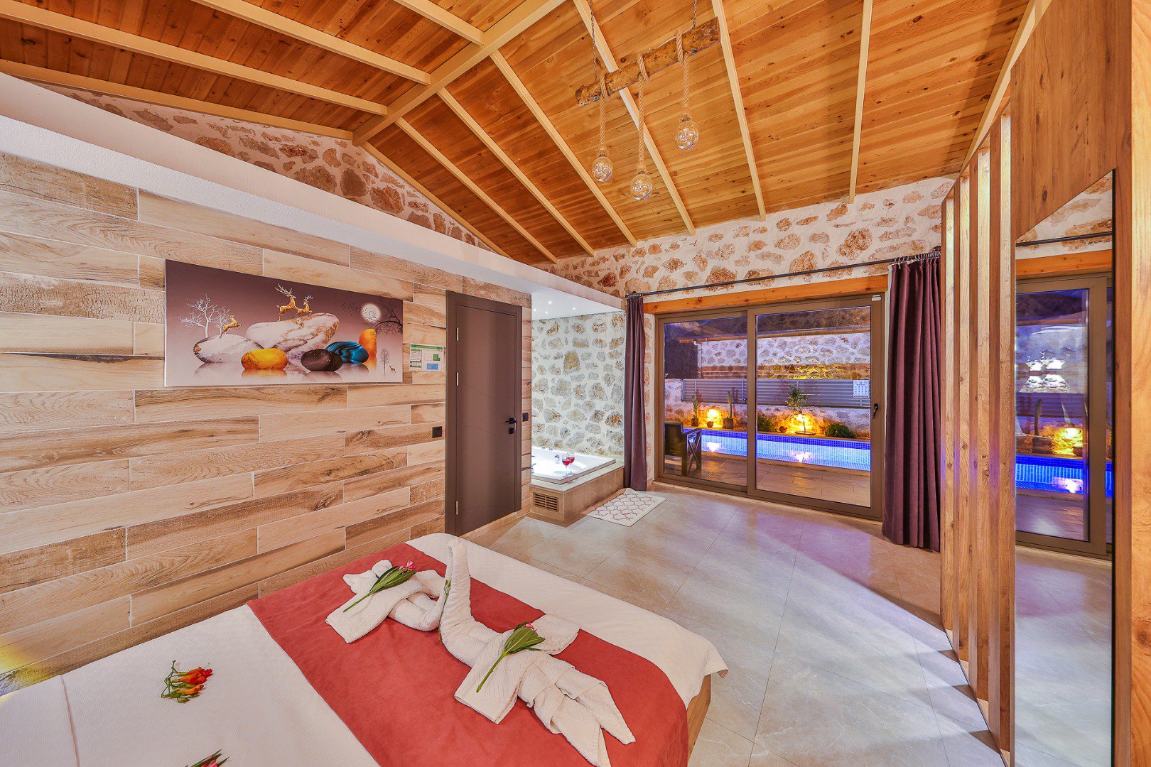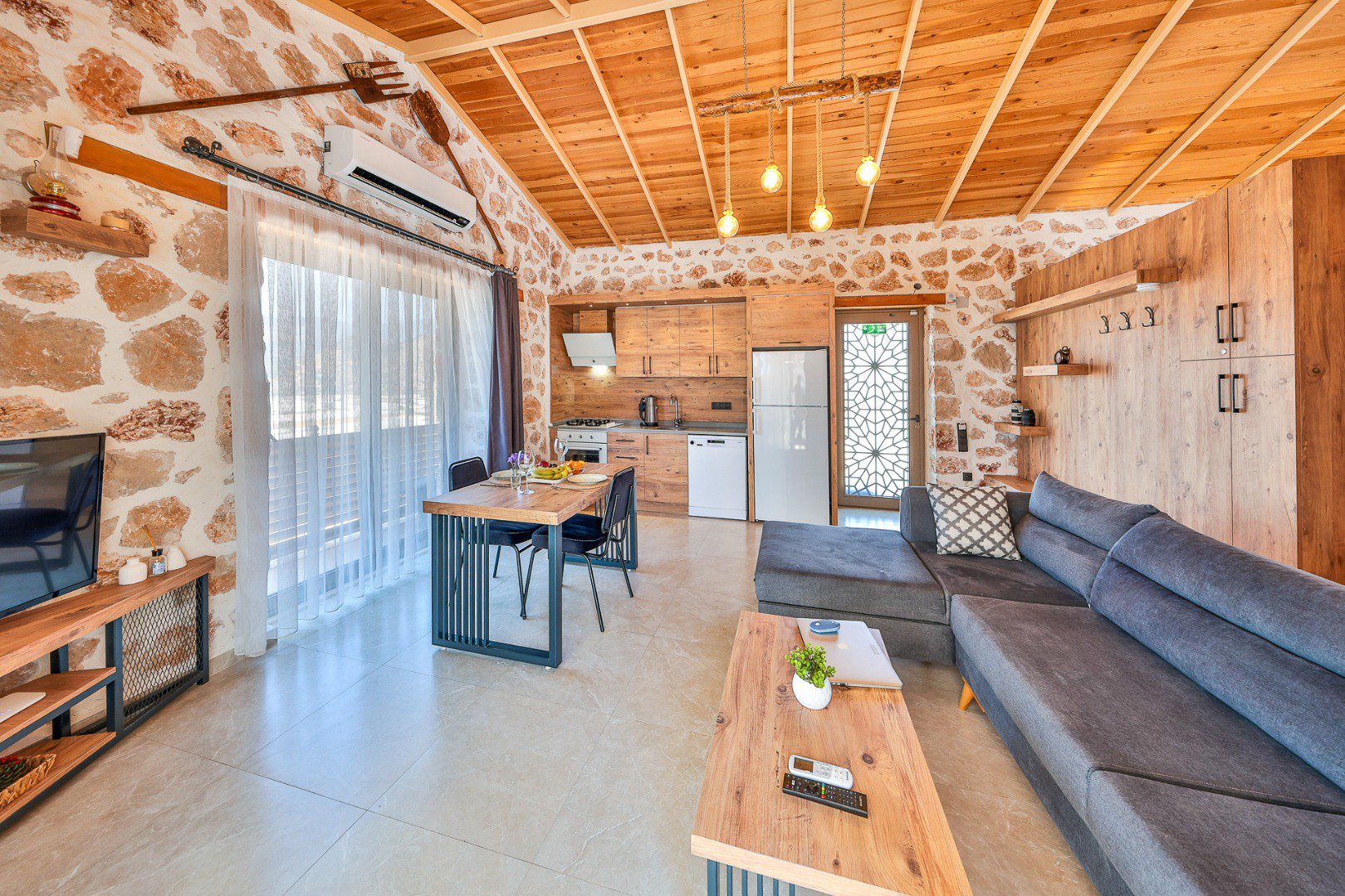 Located in the heart of a breathtaking natural landscape, our villa features a 1+1 layout. Thanks to its large glass doors, guests can enjoy the enchanting beauty of nature at every moment.